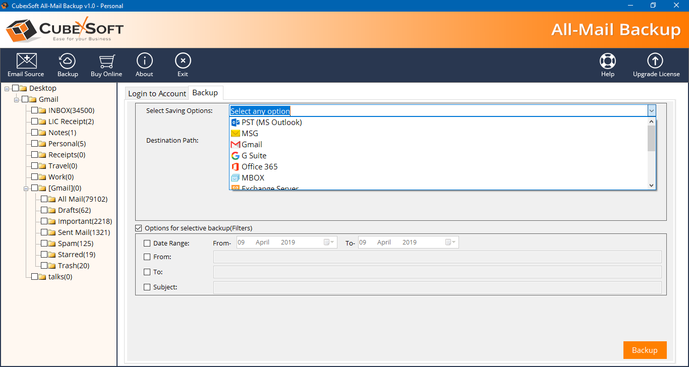 Try ZOOK Email Backup Software is one of the most prominent solution for users to backup emails in bulk from 85+ email services. It is the best and direct way to create emails backup from various email accounts and save emails backup into 30+ saving options. The tool has so simple interface which provides a straightforward solution to download emails, contacts, calendars, etc. from email account. This tool provides multiple saving options to export emails backup to document file formats, desktop based email application file format, and webmail account. It offers to export emails from email account to PST, EML, MSG, MBOX, EMLX, CSV, PDF, ZIP, DOCX, MHT, RTF, Windows Live Mail, Lotus Notes, Thunderbird, Outlook.com, Gmail, Yahoo, G Suite, Exchange Server, IMAP, Zimbra, Rediffmail, IBM Verse, Amazon WorkMail, IceWarp, etc.It provides 100% safe and secure backups of emails. Explore More:- https://www.zooksoftware.com/email/backup/