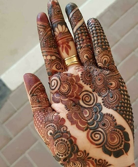 The simplest and easy to apply mehndi design is right in front of you. A simple mandala-like circle design, it can be customized to your liking with just some dots and paisleys on the fingertips. Although a very small and simple design, it easily fills your hand with the circle in the center.