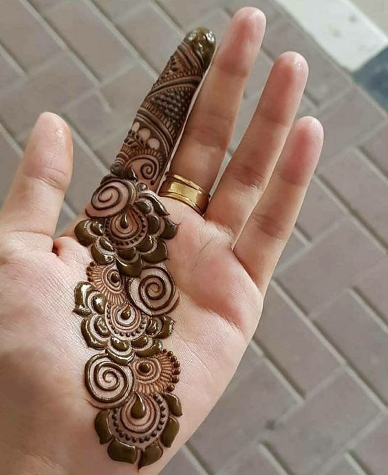 If you are someone who likes adding a more creative touch to their henna designs, then this design is perfect for you. The design also looks like two Rakhi’s kept side by side. This design is beautiful yet does not take a lot of time for application as it just requires some small intricate detailing.